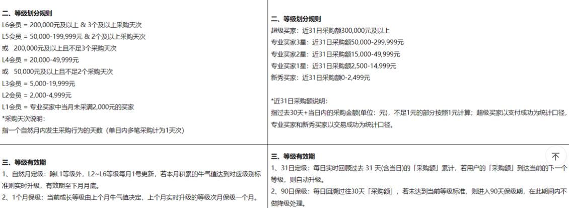 不仅是等级调整了,这次的会员升级,在权益方面也做了全面优化和整合。包括:先采后付、老客价、售后延长、专属客服、采购车扩容等。具体等级划分规则以及等级有效期计算方式可以看下面这张图。